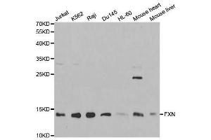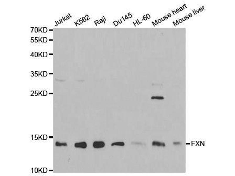 This nuclear gene encodes a mitochondrial protein which belongs to the FRATAXIN family. The protein functions in regulating mitochondrial iron transport and respiration. The expansion of intronic trinucleotide repeat GAA from 8-33 repeats to >90 repeats results in Friedreich ataxia. Alternative splicing results in multiple transcript variants.,FXN,CyaY,FA,FARR,FRDA,X25,frataxin,Signal Transduction,Endocrine & Metabolism,Mitochondrial metabolism,Mitochondrial markers,FXN