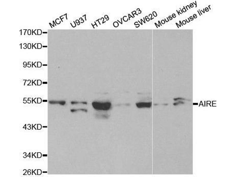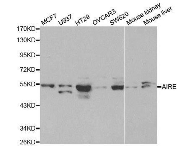 - A synthetic peptide corresponding to a sequence within amino acids 30-130 of human AIRE (NP_000374.1).