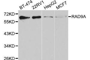 This gene product is highly similar to Schizosaccharomyces pombe rad9, a cell cycle checkpoint protein required for cell cycle arrest and DNA damage repair. This protein possesses 3' to 5' exonuclease activity, which may contribute to its role in sensing and repairing DNA damage. It forms a checkpoint protein complex with RAD1 and HUS1. This complex is recruited by checkpoint protein RAD17 to the sites of DNA damage, which is thought to be important for triggering the checkpoint-signaling cascade. Alternatively spliced transcript variants encoding different isoforms have been found for this gene.,RAD9A,RAD9,Epigenetics & Nuclear Signaling,DNA Damage & Repair,Cell Biology & Developmental Biology,Apoptosis,RAD9A
