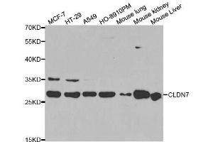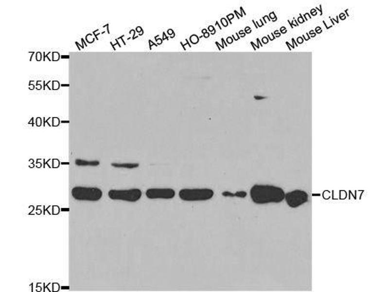 This gene encodes a member of the claudin family. Claudins are integral membrane proteins and components of tight junction strands. Tight junction strands serve as a physical barrier to prevent solutes and water from passing freely through the paracellular space between epithelial or endothelial cell sheets, and also play critical roles in maintaining cell polarity and signal transductions. Differential expression of this gene has been observed in different types of malignancies, including breast cancer, ovarian cancer, hepatocellular carcinomas, urinary tumors, prostate cancer, lung cancer, head and neck cancers, thyroid carcinomas, etc.. Alternatively spliced transcript variants encoding different isoforms have been found.,CLDN7,CEPTRL2,CLDN-7,CPETRL2,Hs.84359,claudin-1,claudin-7,Signal Transduction,Cell Biology & Developmental Biology,Cell Adhesion,Tight Junctions,Cytoskeleton,CLDN7