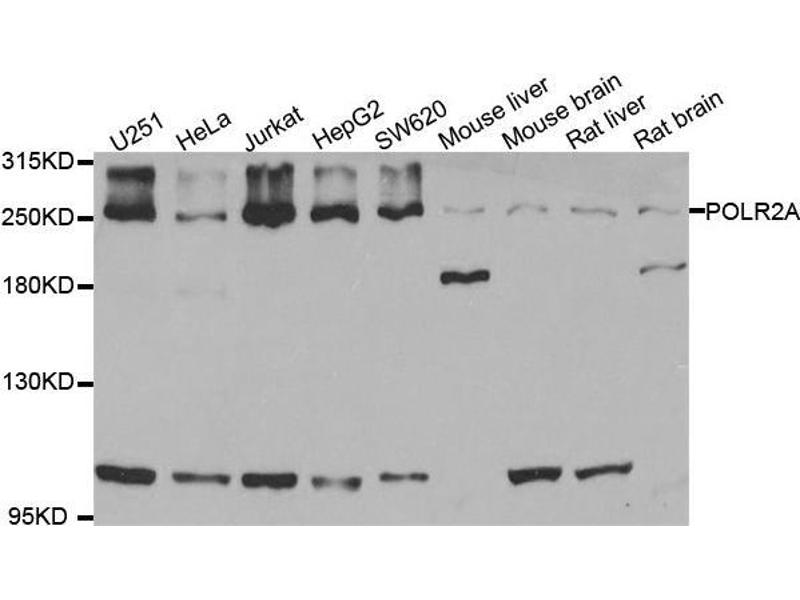 This gene encodes the largest subunit of RNA polymerase II, the polymerase responsible for synthesizing messenger RNA in eukaryotes. The product of this gene contains a carboxy terminal domain composed of heptapeptide repeats that are essential for polymerase activity. These repeats contain serine and threonine residues that are phosphorylated in actively transcribing RNA polymerase. In addition, this subunit, in combination with several other polymerase subunits, forms the DNA binding domain of the polymerase, a groove in which the DNA template is transcribed into RNA.,POLR2A,POLR2,POLRA,RPB1,RPBh1,RPO2,RPOL2,RpIILS,hRPB220,hsRPB1,Pol II,Epigenetics & Nuclear Signaling,DNA Damage & Repair,Neuroscience,Neurodegenerative Diseases,POLR2A