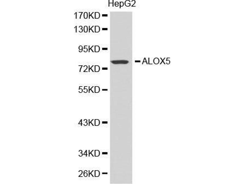 This gene encodes a member of the lipoxygenase gene family and plays a dual role in the synthesis of leukotrienes from arachidonic acid. The encoded protein, which is expressed specifically in bone marrow-derived cells, catalyzes the conversion of arachidonic acid to 5(S)-hydroperoxy-6-trans-8,11,14-cis-eicosatetraenoic acid, and further to the allylic epoxide 5(S)-trans-7,9-trans-11,14-cis-eicosatetrenoic acid (leukotriene A4). Leukotrienes are important mediators of a number of inflammatory and allergic conditions. Mutations in the promoter region of this gene lead to a diminished response to antileukotriene drugs used in the treatment of asthma and may also be associated with atherosclerosis and several cancers. Alternatively spliced transcript variants encoding different isoforms have been found for this gene.,ALOX5,5-LO,5-LOX,5LPG,LOG5,Cancer,Signal Transduction,Endocrine & Metabolism,Lipid Metabolism,Cardiovascular,Heart,Cardiovascular diseases,Heart disease,ALOX5