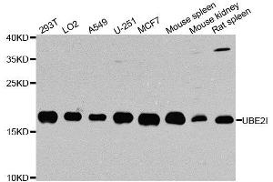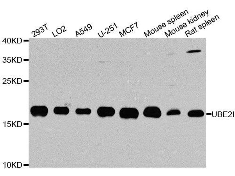 The modification of proteins with ubiquitin is an important cellular mechanism for targeting abnormal or short-lived proteins for degradation. Ubiquitination involves at least three classes of enzymes: ubiquitin-activating enzymes, or E1s, ubiquitin-conjugating enzymes, or E2s, and ubiquitin-protein ligases, or E3s. This gene encodes a member of the E2 ubiquitin-conjugating enzyme family. Four alternatively spliced transcript variants encoding the same protein have been found for this gene.,UBE2I,C358B7.1,P18,UBC9,Epigenetics & Nuclear Signaling,RNA Binding,Cell Biology & Developmental Biology,Apoptosis,Ubiquitin,Ubiquitin-Proteasome Signaling Pathway,Endocrine & Metabolism,Endocrine and metabolic diseases,Obesity,UBE2I
