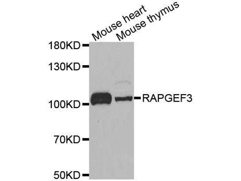 Guanine nucleotide exchange factor (GEF for RAP1A and RAP2A small GTPases that is activated by binding cAMP. Through simultaneous binding of PDE3B to RAPGEF3 and PIK3R6 is assembled in a signaling complex in which it activates the PI3K gamma complex and which is involved in angiogenesis. Plays a role in the modulation of the cAMP-induced dynamic control of endothelial barrier function through a pathway that is independent on Rho-mediated signaling. Required for the actin rearrangement at cell-cell junctions, such as stress fibers and junctional actin.,RAPGEF3,CAMP-GEFI,EPAC,EPAC1,HSU79275,bcm910,Signal Transduction,G protein signaling,G2/M DNA Damage Checkpoint,MAPK-Erk Signaling Pathway,Endocrine & Metabolism,Immunology & Inflammation,RAPGEF3