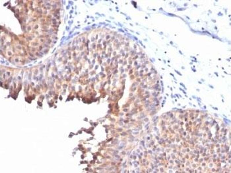 - This mAb recognizes a protein of 56.5 kDa, identified as cytokeratin 10 (CK10). CK10 is expressed in all suprabasal layers of the epidermis. In the epidermis, expression of CK10 strictly parallels the extent of differentiation, it is absent in the basal layer, appears in the first suprabasal layers and increases in concentration towards the granular layer. However, CK10 is rarely detected in early stages of vulvar squamous carcinomas (tumors less than 2 cm, clinical stage I) regardless of the tumor grade. In larger and more advanced tumors (greater than 2 cm, clinical stages II and III), CK10 is detected very frequently. Expression of CK10 is related to maturation of malignant keratinocytes, being preferentially detected in more-differentiated parts.