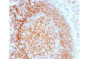CD74 is a type II transmembrane protein which binds to the peptide binding groove of newly synthesized MHC class II alpha/beta heterodimers and prevents their premature association with endogenous polypeptides. CD74 is expressed primarily by antigen presenting cells, such as B-lymphocytes (from before the pre-B cell stage to before the plasma cell stage), macrophages, and monocytes, and many epithelial cells. CD74 antibody stains predominantly germinal center lymphocytes and B-cell lymphomas, but rarely T-cell lymphomas. antibody to CD74 has been shown to be useful in differentiating atypical fibroxanthoma (-) from malignant fibrous histiocytoma (+).