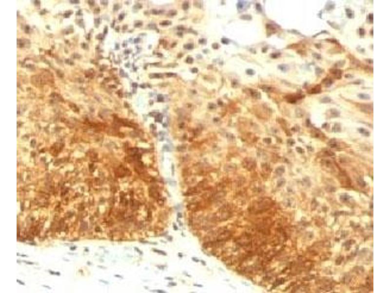 - Cytokeratin 14 (CK14) belongs to the type I (or A or acidic) subfamily of low molecular weight keratins and exists in combination with keratin 5 (type II or B or basic). Cytokeratin 14 is found in basal cells of squamous epithelia, some glandular epithelia, myoepithelium, and mesothelial cells. antibody to cytokeratin 14 is useful in differentiating squamous cell carcinomas from poorly differentiated epithelial tumors. cytokeratin 14 antibody is one of the specific basal markers for distinguishing between basal and non-basal subtypes of breast carcinomas. Cytokeratin 14 antibody is also a good marker for differentiation of intraductal from invasive salivary duct carcinoma by the positive staining of basal cells surrounding the in-situ neoplasm as well as for differentiation of benign prostate from prostate carcinoma. Furthermore, this antibody has been useful in separating oncocytic tumors of the kidney from its renal mimics, and in identifying metaplastic carcinomas of the breast.