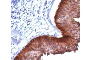 - Cytokeratin 17 (CK17, Keratin 17) is a member of the Cytokeratin subfamily of intermediate filament proteins (IFP's). It is unique in that it is normally expressed in the basal cells of complex epithelia but not in stratified or simple epithelia. Cytokeratin 17 is expressed in the nail bed, hair follicle, sebaceous glands and other epidermal appendages. Antibody to cytokeratin 17 is an excellent tool to distinguish myoepithelial cells from luminal epithelium of various glands such as mammary, sweat and salivary. It is expressed in epithelial cells of various origins, such as bronchial epithelial cells and skin appendages. It may be considered as ""epithelial stem cell"" marker because cytokeratin 17 antibody marks basal cell differentiation. Cytokeratin 17 can be useful when included in a panel of antibodies against TTF-1, napsin A, CK5&6, p63, and SOX-2 for diagnostic differentiation between lung adenocarcinoma (LADC) and lung squamous cell carcinoma (SCLC), especially for poorly-differentiated lung carcinoma. Cytokeratin 17 is expressed in SCLC much higher than in LADC. In breast carcinomas, approximately 20 % of patients show no expression of ER, PR and Her2, which are defined as triple negative tumor. Eighty-five percent of the triple negative breast carcinomas immunoreact with basal cytokeratins including cytokeratin 17 antibody. Also important is that cases of triple negative breast carcinoma with expression of keratin 17 show an aggressive clinical course. The histologic differentiation of ampullary cancer, intestinal vs. pancreatobiliary, is very important for treatment. Usually antibody to cytokeratin 17 and MUC1 immunoreactivity represents pancreatobiliary subtype whereas antibody to MUC2 and CDX2 positivity defines intestinal subtype.