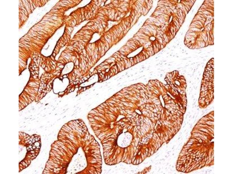 - Cytokeratin 8 (CK8) belongs to the type II (or B or basic) subfamily of high molecular weight cytokeratins and exists in combination with cytokeratin 18 (CK18). Cytokeratin 8 is primarily found in the non-squamous epithelia and is present in majority of adenocarcinomas and ductal carcinomas. It is absent in squamous cell carcinomas. Hepatocellular carcinomas are defined by the use of antibody that recognizes only cytokeratin 8 and 18. Cytokeratin 8 exists on several types of normal and neoplastic epithelia, including many ductal and glandular epithelia such as colon, stomach, small intestine, trachea, and esophagus as well as in transitional epithelium. Antibody to Cytokeratin 8 does not react with skeletal muscle or nerve cells. Epithelioid sarcoma, chordoma, and adamantinoma show strong positivity corresponding to that of simple epithelia (with antibodies against Cytokeratin 8, 18 and 19). Reportedly, Cytokeratin 8 antibody is useful for the differentiation of lobular (""ring-like, perinuclear"") from ductal (""peripheral-predominant"") carcinoma of the breast.