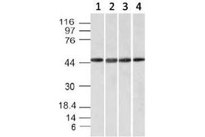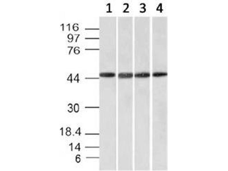 - A recombinant fragment (203 amino acid residues between aa 1-250) from the human protein was used as the immunogen for the EMI1 antibody.
