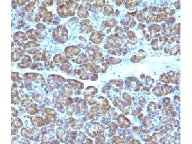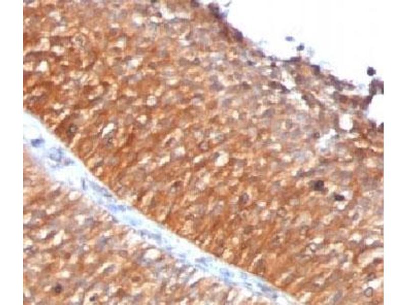 1. Staining of formalin-fixed tissues is enhanced by boiling tissue sections in 10 mM Citrate Buffer, pH 6.0, for 10-20 min followed by cooling at RT for 20 minutes.