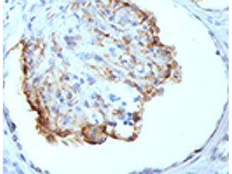 - Recognizes a 47-55 kDa-tumor suppressor protein, identified as Wilm's Tumor (WT1) protein. The antibody reacts with all isoforms of the full-length WT1 and also identifies WT1 lacking exon 2-encoded amino acids, frequently found in subsets of sporadic Wilm s tumors. WT1, a sporadic and familial pediatric kidney tumor, is genetically heterogeneous. Wilm s tumor is associated with mutations of WT1, a zinc-finger transcription factor that is essential for the development of the metanephric kidney and the urogenital system. The WT1 gene is normally expressed in fetal kidney and mesothelium, and its expression has been suggested as a marker for Wilm s tumor and mesothelioma. WT1 protein has been identified in proliferative mesothelial cells, malignant mesothelioma, ovarian carcinoma, gonadoblastoma, nephroblastoma, and desmoplastic small round cell tumor. Lung adenocarcinomas rarely stain positive with this antibody. WT1 protein expression in mesothelial cells has become a reliable marker for the diagnosis of mesotheliomas.