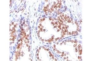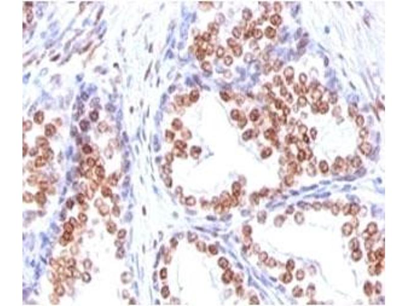 - Recognizes a protein of 110 kDa, which is identified as androgen receptor (AR). It reacts with full length, and the newly described A form of the receptor. It does not cross react with estrogen, progesterone, or glucocorticoid receptors. The expression of AR is reportedly inversely correlated with histologic grade i.e. well differentiated prostate tumors show higher expression than the poorly differentiated tumors. In prostate cancer, AR has been proposed, as a marker of hormone-responsiveness and thus it may be useful in identifying patients likely to benefit from anti-androgen therapy. Anti-androgen receptor has been useful clinically in differentiating morpheaform basal cell carcinoma (mBCC) from desmoplastic trichoepithelioma (DTE) in the skin. This mAb is superb for staining of formalin/paraffin tissues.