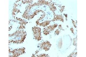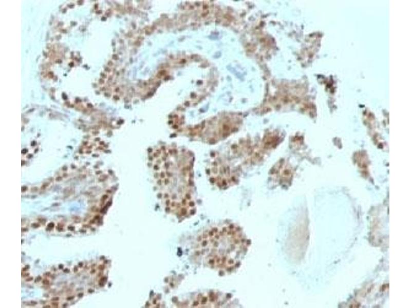 - Recognizes a protein of 57 kDa, identified as p57Kip2. It shows no cross-reaction with p27Kip1. p57Kip2 is a potent tight-binding inhibitor of several G1 cyclin complexes, and is a negative regulator of cell proliferation. Anti-p57 has been used as an aide in identification of complete hydatidiform mole (CHM) (no nuclear labeling of cytotrophoblasts and stromal cells) from partial hydatidiform mole (PHM) in which both cytotrophoblasts and stromal cells stain. The histological differentiation of complete mole, partial mole, and hydropic spontaneous abortion is problematic. Most complete hydatidiform moles are diploid, whereas most partial moles are triploid. Ploidy studies will identify partial moles, but will not differentiate complete moles from non-molar gestations. Complete moles carry a high risk of persistent disease and choriocarcinoma, while partial moles have a very low risk. In normal placenta, many cytotrophoblast nuclei and stromal cells are labeled with this antibody. Similar findings apply to PHM and hydropic abortus tissues. Intervillous trophoblastic islands (IVTIs) demonstrate nuclear labeling in all three entities and serve as an internal control.