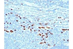 Recognizes S100A8/MPR8 and S100A9/MRP14, an intra-cytoplasmic antigen comprising of a 12  kDa alpha chain and a 14  kDa beta chain expressed by granulocytes, monocytes and by tissue macrophages. Macrophages usually arise from hematopoietic stem cells in the bone marrow. Under migration into tissues, the monocytes undergo further differentiation to become multifunctional tissue macrophages. They are classified into normal and inflammatory macrophages. Normal macrophages include macrophages in connective tissue (histiocytes), liver (Kupffer's cells), lung (alveolar macrophages), lymph nodes (free and fixed macrophages), spleen (free and fixed macrophages), bone marrow (fixed macrophages), serous fluids (pleural and peritoneal macrophages), skin (histiocytes, Langerhans's cell) and in other tissues. Inflammatory macrophages are present in various exudates. Macrophages are part of the innate immune system, recognizing, engulfing and destroying many potential pathogens including bacteria, pathogenic protozoa, fungi and helminthes. This mAb reacts with neutrophils, monocytes, macrophages, and squamous mucosal epithelia and has been shown as an important marker for identifying macrophages in tissue sections.