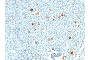 - Recognizes the L1 or Calprotectin molecule, also called S100A8/9 and MRP8/14, an intra-cytoplasmic antigen comprising of a 12 kDa alpha chain and a 14 kDa beta chain. Calprotectin comprises 60 % of the cytoplasmic protein fraction of circulating polymorphonuclear granulocytes and is also found in monocytes, macrophages and ileal tissue eosinophils. Peripheral blood monocytes carry the antigen extra- and intracellularly, neutrophils only intracellularly. Calprotectin has antibacterial, antifungal, immunomodulating and antiproliferative effects. Besides this it is a potent chemotactic factor for neutrophils. Plasma concentrations are elevated in diseases associated with increased neutrophil activity, like inflammatory bowel disease. Granulocytes terminate their existence after transmigration through the intestinal wall. Therefore calprotectin is also detectable in feces. Elevated levels of calprotectin have been observed in body fluids such as plasma, saliva, gingival crevicular fluid, stools, and synovial fluid during infection and inflammatory conditions. This mAb reacts with neutrophils, monocytes, macrophages, and squamous mucosal epithelia and is important for identifying macrophages in tissue sections.
