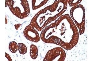 - This Ab reacts with the rod domain of human cytokeratin 19 (CK19), a polypeptide of 40 kDa. CK19 is expressed in sweat gland, mammary gland ductal and secretory cells, bile ducts, gastrointestinal tract, bladder urothelium, oral epithelia, esophagus, and ectocervical epithelium. Anti-CK19 reacts with a wide variety of epithelial malignancies including adenocarcinomas of the colon, stomach, pancreas, biliary tract, liver, and breast. Perhaps the most useful application is the identification of thyroid carcinoma of the papillary type, although 50 % -60 % of follicular carcinomas are also labeled. Anti-CK19 is a useful marker for detection of tumor cells in lymph nodes, peripheral blood, bone marrow and breast cancer.