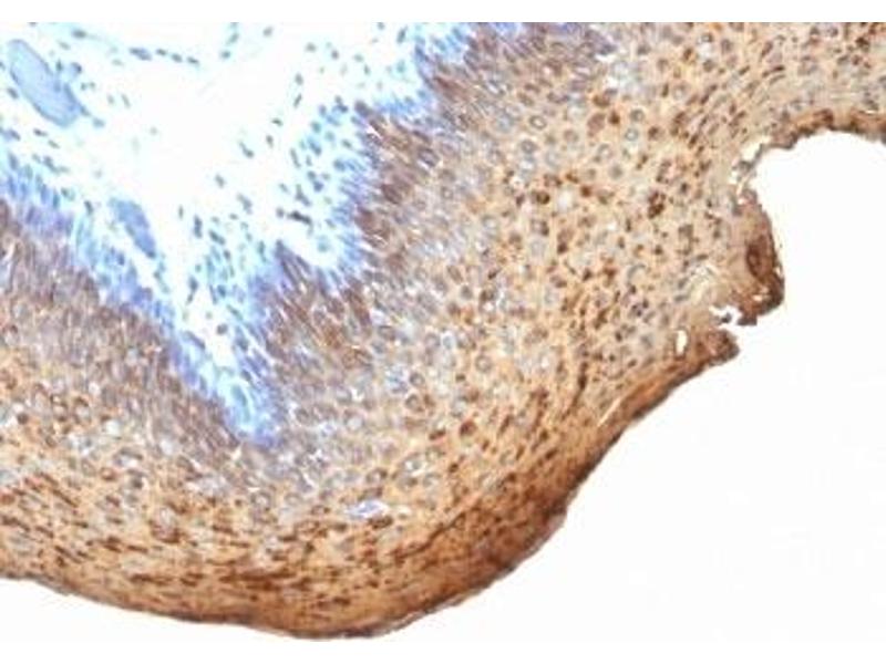 - This antibody recognizes cytokeratin 10 (56.5 kDa) and cytokeratin 13 (53 kDa) in Western blotting. It recognizes only cytokeratin 13 in formalin-fixed, paraffin-embedded tissue sections. It does not react with cytokeratin 10 positive, cytokeratin 13 negative epithelia such as epidermis. However, on frozen sections this mAb serves as differentiation-related marker of all stratified epithelia, it stains all suprabasal cells in both cornifying and non-cornifying stratified epithelia and more differentiated cells of squamous carcinomas.
