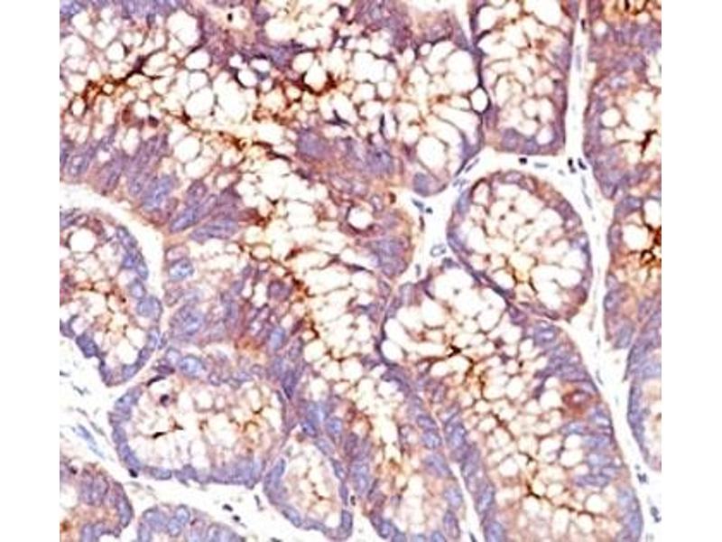 - This antibody recognizes proteins of 80-200 kDa, identified as different members of CEA family. CEA is synthesized during development in the fetal gut and is re-expressed in increased amounts in intestinal carcinomas and several other tumors. This mAb does not react with nonspecific cross-reacting antigen (NCA) and with human polymorphonuclear leucocytes. It shows no reaction with a variety of normal tissues and is suitable for staining of formalin/paraffin tissues. CEA is not found in benign glands, stroma, or malignant prostatic cells. Antibody to CEA is useful in detecting early foci of gastric carcinoma and in distinguishing pulmonary adenocarcinomas (60-70 % are CEA+) from pleural mesotheliomas (rarely or weakly CEA+). Anti-CEA positivity is seen in adenocarcinomas from the lung, colon, stomach, esophagus, pancreas, gallbadder, urachus, salivary gland, ovary, and endocervix.