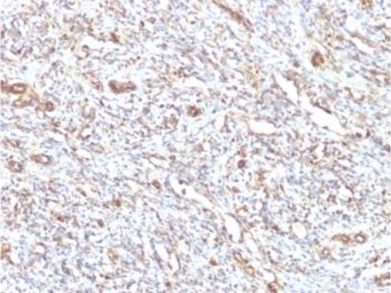 - This mAb reacts with a 58 kDa protein identified as vimentin. It shows no cross-reaction with other closely related intermediate filament proteins (IFPs) such as desmin, keratin, neurofilament, and glial fibrillary acid protein. Anti-vimentin alone is of limited value as a diagnostic tool, however, when used in panels with other antibodies, it is useful for the sub-classification of a given tumor. Expression of vimentin, when used in conjunction with anti-keratin, is helpful when distinguishing melanomas from undifferentiated carcinomas and large cell lymphomas. All melanomas and Schwannomas react strongly with anti-vimentin. It labels a variety of mesenchymal cells, including melanocytes, lymphocytes, endothelial cells, and fibroblasts. Non-reactivity of anti-vimentin is often considered more useful than its positive reactivity, since there are a few tumors that do not contain vimentin, e.g. hepatoma and seminoma. Anti-vimentin is also useful as a tissue process control reagent.