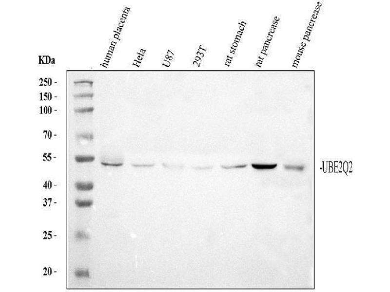 - A synthetic peptide corresponding to a sequence at the N-terminus of human UBE2Q2, different from the related mouse sequence by four amino acids.