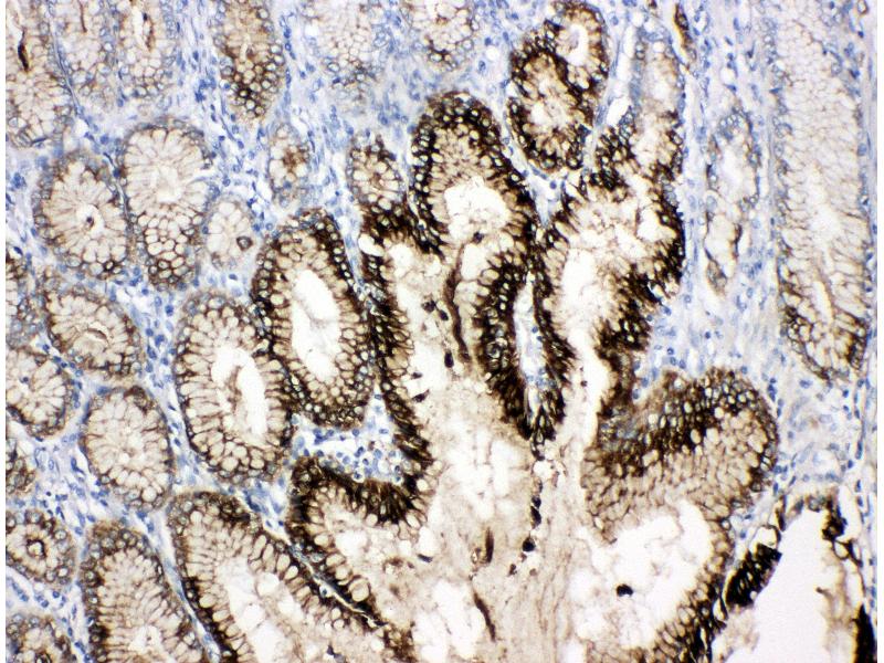 Tissue Specificity: Found in stomach, with highest levels in the upper gastric mucosal cells (at protein level). Detected in goblet cells of the small and large intestine and rectum, small submucosal glands in the esophagus, mucous acini of the sublingual gland, submucosal glands of the trachea, and epithelial cells lining the exocrine pancreatic ducts but not in the remainder of the pancreas (at protein level). Scattered expression is detected in the epithelial cells of the gallbladder and submucosal glands of the vagina, and weak expression is observed in the bronchial goblet cells of the pseudostratified epithelia in the respiratory system (at protein level). Detected in urine (at protein level). Strongly expressed in breast cancer but at low levels in normal mammary tissue. It is regulated by estrogen in MCF-7 cells. Strong expression found in normal gastric mucosa and in the regenerative tissues surrounding ulcerous lesions of gastrointestinal tract, but lower expression found in gastric cancer (at protein level). .