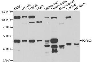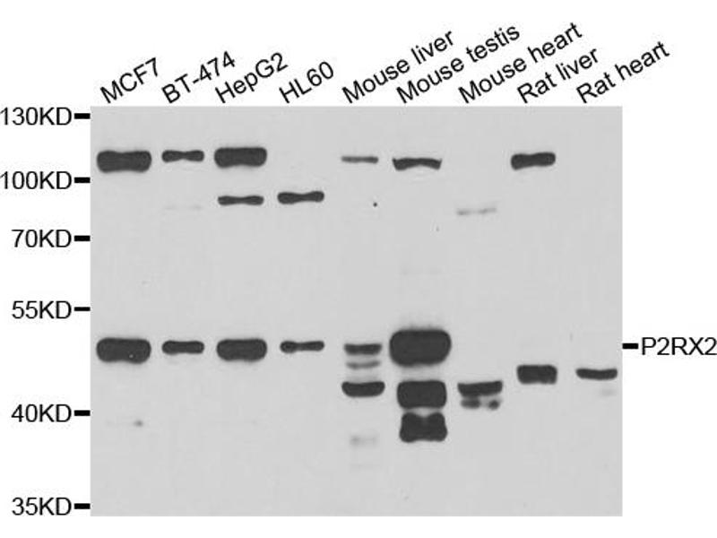 The Rabbit Polyclonal anti-P2RX2 antibody has been validated for WB. It is suitable to detect P2RX2 in samples from Human, Mouse and Rat.