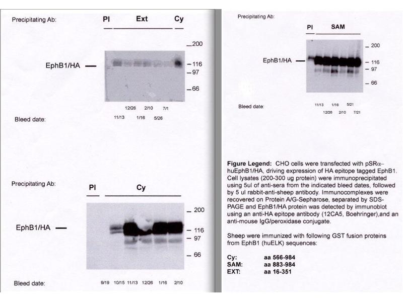 The Sheep Polyclonal anti-EPH Receptor B1 antibody is suitable to detect EPH Receptor B1 in samples from Human. It has been validated for WB.