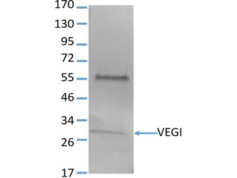 Vascular endothelial cell growth inhibitor (VEGI), a member of the tumor necrosis factor (TNF) family, is an endothelial cell-specific inhibitor of angiogenesis. Overexpression of a secretable VEGI fusion protein by cancer cells resulted in abrogation of xenograft tumor progression. 4-3H8B is a mouse monoclonal IgG1 raised against a recombinant VEGI isoform which shares a C-terminal 151-residue segment with previously reported VEGI with 174 residues.