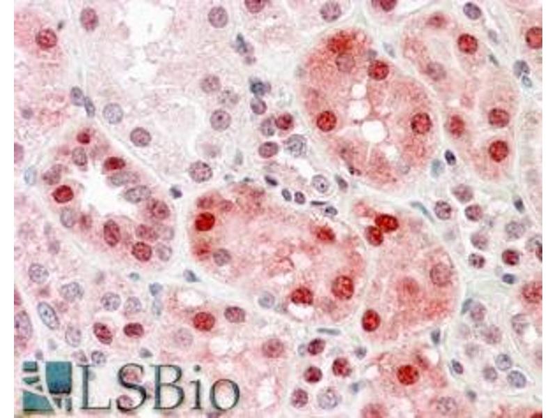 Immunohistochemistry: In paraffin embedded Human Kidney shows nuclear staining in PCT. Recommended concentration: 3-6 μg/mL.