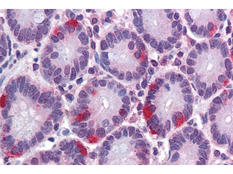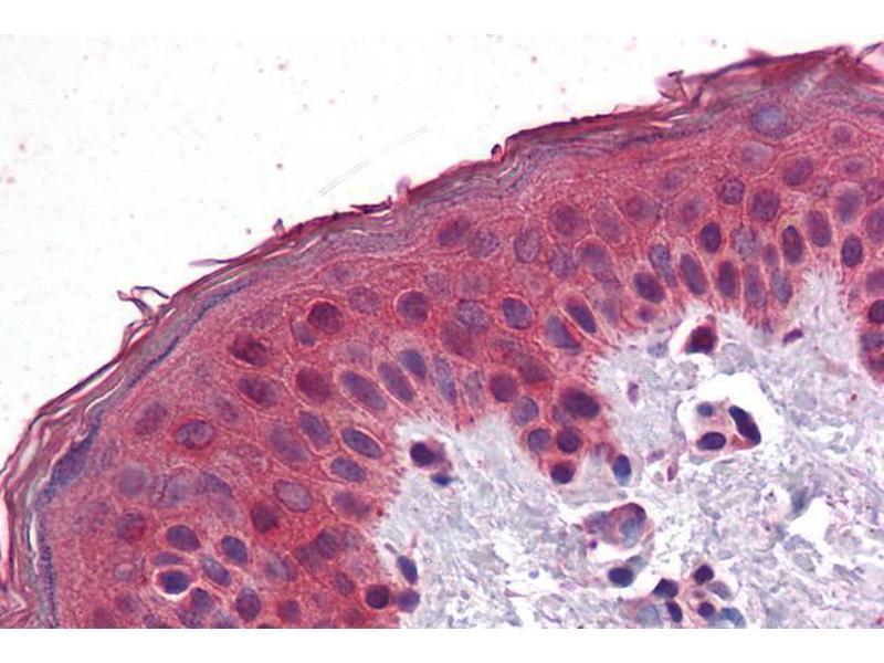 Immunohistochemistry: Paraffin embedded Human Skin and Small Intestine. Recommended concentration: 3.75 μg/mL.