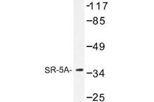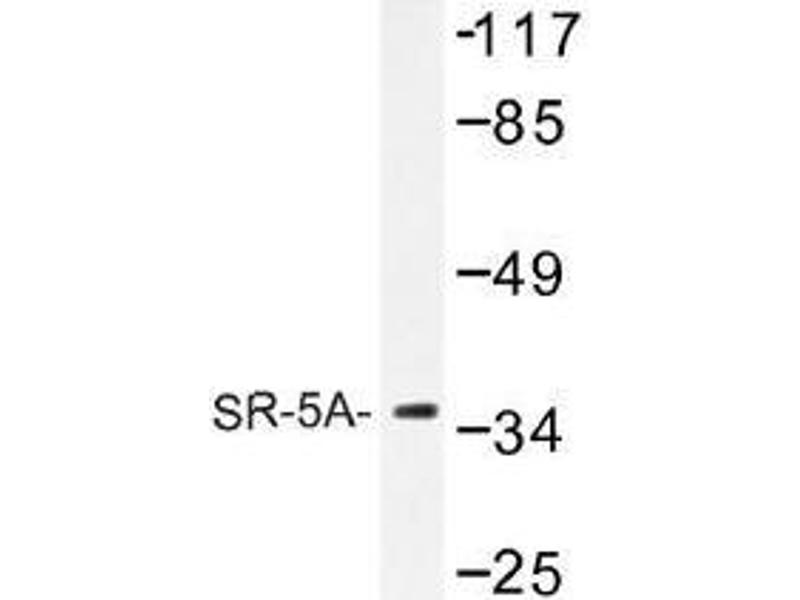 SR-5B, also designated 5-hydroxytryptamine (serotonin) receptor 5B (5-HT5B) and G protein-coupled receptor 134 (GPR134) is a receptor for the monoamine ligand serotonin (5-hydroxytryptamine, 5-HT). Serotonin is a neurotransmitter derived from serotonergic neurons in the central nervous system and enterochromaffin cells in the gastrointestinal tract. Serotonin actions are mediated by receptors that influence the biochemistry of depression, anxiety, sexuality and appetite. Rat SR-5B is present in serotonergic neurons in dorsal raphe (DR) and central superior nucleus (CS, median raphe nucleus). DR cell bodies showing SR-5B mRNA expression are abundant in the medial portions of the nucleus. CS coexpression of SR-5B receptor mRNA with serotonin transporter mRNA is high in the intermediate portions of the nucleus. Serotonin receptors include SR-1-7 (5HT1-7). Subtypes within the SR-1 group include SR-1A, -1B, -1D, -1E and -1F. Subtypes within the SR-2 group include SR-2A, -2B and -2C. Subtypes within the SR-5 group include SR-5A and -5B. SR receptors can couple to G proteins that act on either adenylate cyclase or phospholipase C (PLC). The SR-3 class of receptors are ion channels.Synonyms: 5-HT-5, 5-HT-5A, 5-HT5A, 5-hydroxytryptamine receptor 5A