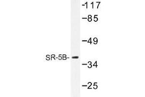 SR-5B, also designated 5-hydroxytryptamine (serotonin) receptor 5B (5-HT5B) and G protein-coupled receptor 134 (GPR134), is a receptor for the monoamine ligand serotonin (5-hydroxytryptamine, 5-HT). Serotonin is a neurotransmitter derived from serotonergic neurons in the central nervous system and enterochromaffin cells in the gastrointestinal tract. Serotonin actions are mediated by receptors that influence the biochemistry of depression, anxiety, sexuality and appetite. Rat SR-5B is present in serotonergic neurons in dorsal raphe (DR) and central superior nucleus (CS, median raphe nucleus). DR cell bodies showing SR-5B mRNA expression are abundant in the medial portions of the nucleus. CS coexpression of SR-5B receptor mRNA with serotonin transporter mRNA is high in the intermediate portions of the nucleus. Serotonin receptors include SR-1-7 (5-HT1-7). Subtypes within the SR-1 group include SR-1A, -1B, -1D, -1E and -1F. Subtypes within the SR-2 group include SR-2A, -2B and -2C. Subtypes within the SR-5 group include SR-5A and -5B. SR receptors can couple to G proteins that act on either adenylate cyclase or phospholipase C (PLC). The SR-3 class of receptors are ion channels.Synonyms: 5-HT-5B, 5-HT5B, 5-hydroxytryptamine receptor 5B, 5HT5B, MR22