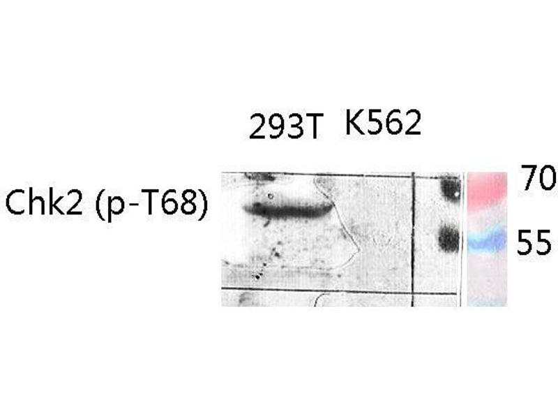 Phospho-Chk2 (T68) Polyclonal Antibody detects endogenous levels of Chk2 protein only when phosphorylated at T68.