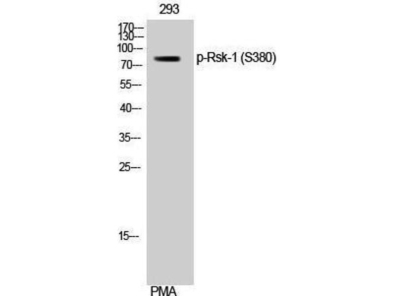 Phospho-Rsk-1 (S380) Polyclonal Antibody detects endogenous levels of Rsk-1 protein only when phosphorylated at S380.