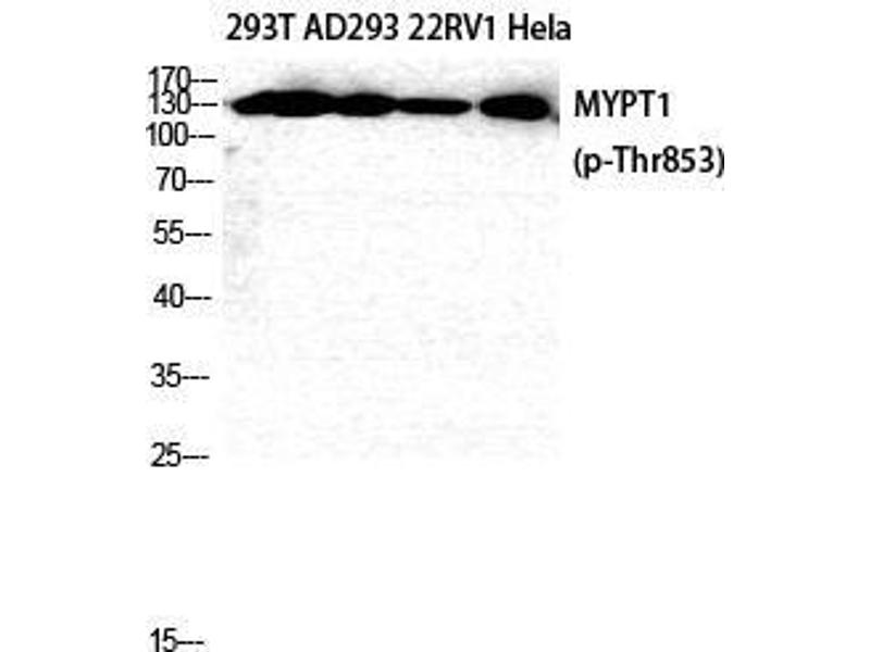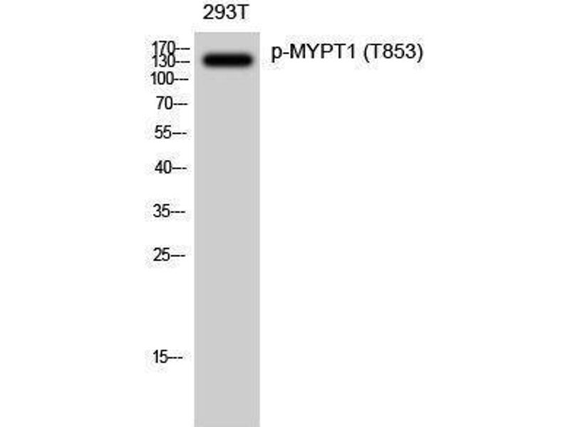 Phospho-MYPT1 (T853) Polyclonal Antibody detects endogenous levels of MYPT1 protein only when phosphorylated at T853.