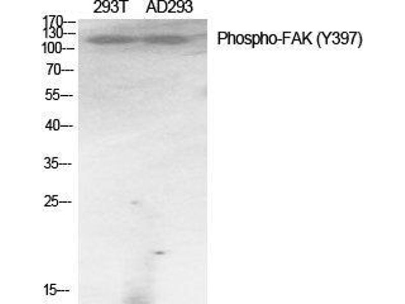 Phospho-FAK (Y397) Polyclonal Antibody detects endogenous levels of FAK protein only when phosphorylated at Y397.