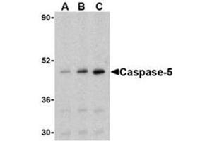 Caspase-5 has been shown to be expressed at higher levels in the colon, lung, spleen, small intestine and by peripheral blood lymphocytes. Caspase-5 is a member of a growing number of inflammatory caspases belonging to the Caspase-1 (ICE-type) subfamily, which require proteolytic processing of their inactive precursor into smaller active subunits. Unlike Caspase-1, Caspase-5 is not directly responsible for the activation of IL-1Beta from the pro-IL-1Beta precursor, but the presence of Caspase-5 does appear to enhance the processing of IL-1Beta. The in vivo expression of Caspase-5 is elevated by Lipopolysaccharide (LPS) and gene expression is also increased by Interferon gamma (IFNg). In vitro studies have shown cleavage of Caspase-5 by the serine protease Granzyme B, which plays a major role in Cytotoxic T lymphocyte (CTL)-induced apoptosis (1).Synonyms: CASP-5, CASP5, ICE(rel)-III, ICH-3 protease, ICH3, TY protease