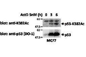 - P53 mutants are found in more than half of human cancers and are considered as the most important human cancer related gene. p53 is detected at 53kD position by electrophoresis and is composed of 393 amino acids. In the unstressed normal cells, the p53 level is low and it is inactive. However, with stress, especially with DNA damage, it is activated to promote arrest of cell cycle and repair of DNA damage, or induction of apoptosis. The functions and stability of p53 are regulated by phosphorylation of serine and threonine, and acetylation of lysine at various sites in the molecule. Acetylation of lysine 382 (acetyl-K382) of p53 occurs after DNA damage and is catalyzed by the p300/CBP acetyltransferase, which stabilizes p53 proten.
