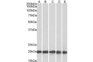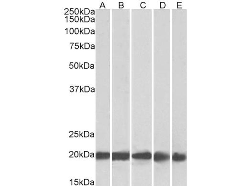 Western Blot: Approx. 20 kDa band observed in Human Brain (Cerebellum), Liver, Placenta and 22 kDa in Mouse and Rat Brain lysates (calculated MW of 20.0 kDa according to NP_000137.2). Recommended concentration: 0.3-1.0 μg/mL. Primary incubation was 1 hour.