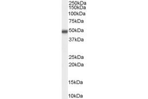 Western Blot: Approx 48-50 kDa band observed in lysates of cell line Jurkat (calculated MW of 43.3 kDa according to NP_003918.1). The observed molecular weight corresponds to earlier findings in literature with different antibodies (Tan et al, Mol Cell Bio