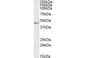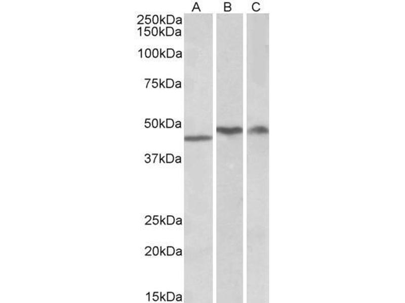 Western Blot: Approx. 45 kDa band observed in lysates of cell line Jurkat and in Human Cerebellum and approx. 48 kDa in Human Frontal Cortex and Hippocampus lysates (calculated MW of 44.7 kDa according to NP_031401.1). Recommended concentration: 0.3-1 μg/mL.