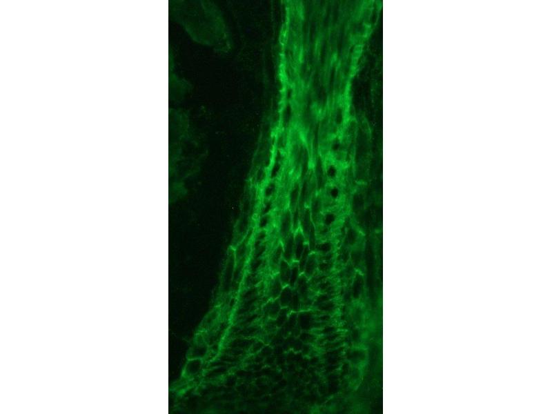 23E3/4 reacts with an epitope located between residues 570-589 in human plakophilin-3. 23E3/4 is suitable for immunocytochemistry (methanol- and paraformaldehyde-fixed cells), immunohistochemistry on frozen and paraffin-embedded tissues, immunoprecipitation and Western blot detection. For optimal results, fixed cells and frozen tissues should be treated with 0.2% Triton-X 100 for, respectively, 5 min and 15 min prior to incubation with primary antibody. Optimal antibody dilution should be determined by titration, recommended range is 1:25 - 1:200 for immunohistochemistry with avidin-biotinylated horseradish peroxidase complex (ABC) as detection reagent, and 1:100 - 1:1000 for immunoblotting applications.