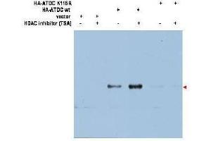 Application Note: This affinity purified antibody has been tested for use in ELISA and western blotting. Specific conditions for reactivity and detection of ATDC Ac-K116 should be optimized by the end user. Expect a band approximately ~66 kDa in size corresponding to ATDC Ac-K116 by western blotting in the appropriate cell lysate or extract.