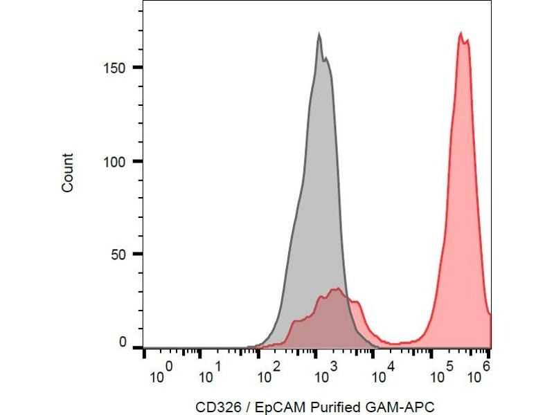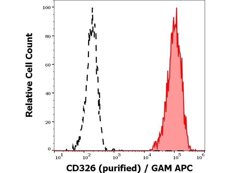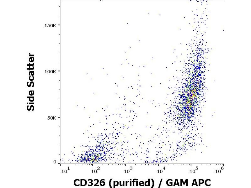 Epithelial cell adhesion molecule,CD326 / EpCAM (also known as ESA, EGP40, EGP-2, KSA1/4, CO17-1A, GA733-2, MOC31, Ber-EP4) is a 40 kDa transmembrane glycoprotein serving as adhesion molecule in the basolateral membranes in a variety of epithelial cells. CD326 mediates calcium-independent homotypic cell-cell adhesions. CD326 over-expression has been detected in many epithelial tumours and is often associated with bad prognosis. It has been used for diagnostics of (pre-) malignancies at early stages.,EPCAM, GA733-2, EGP314, KSA, KS 1/4 antigen, Trop-1, M4S1, DIAR5, MIC18, TROP1
