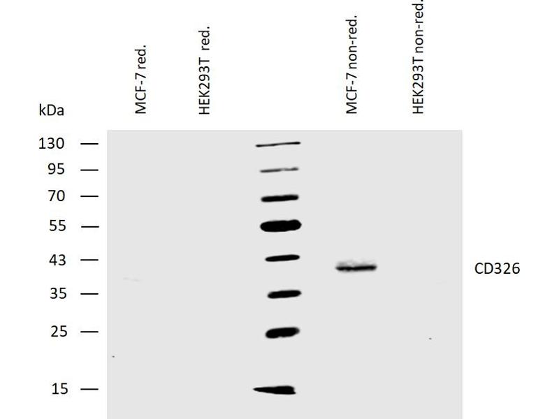 The mouse monoclonal antibody VU-1D9 recognizes an extracellular epitope within EGF-like domain I of CD326 / EpCAM, a marker of epithelial lineages. This antibody strongly stains various normal epithelial cells and carcinomas.