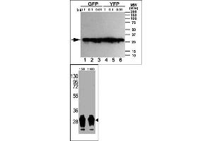 Green fluorescent protein (GFP), originally isolated from the jellyfish Aequorea victoria, is one of the best visual reporters for monitoring gene expression in vivo and in situ. GFP is a also convenient marker for use in flow cytometry because it eliminates the need to incubate with asecondary reagent (such as dyes or antibodies) for detection. However, anti-GFP antibody is also widely used for co-immunoprecipitation, co-localization or western blotting for the confirmation of specificity when a GFP fusion protein is expressed in cells. This monoclonal antibody provides a simple solution to detect the expression of a GFP-tagged protein in cells. Because of its ability to spontaneously generate its own fluorophore, the green fluorescent protein (GFP) from the jellyfish Aequorea victoria is used extensively as a fluorescent marker in molecular and cell biology. The yellow fluorescent proteins (YFPs) have the longest wavelength emissions of all GFP variants examined to date. This shift in the spectrum is the result of a T203Y substitution (single-letter amino acid code), a mutation rationally designed on the basis of the X-ray structure of GFP S65T. Anti-GFP monoclonal antibody can detect both GFP and YFP but not BFP (Blue fluorescent protein) by western blotting.Synonyms: GFP-Tag, Green fluorescent protein