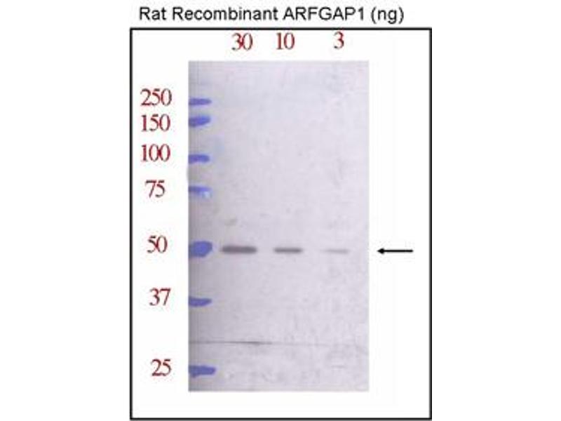 ARFGAP1 is a GTPase-activating protein (GAP) which associates with the Golgi apparatus and which interacts with ADP-ribosylation factor 1 (ARF1). The encoded protein promotes hydrolysis of ARF1-bound GTP and is required for the dissociation of coat proteins from Golgi-derived membranes and vesicles. Dissociation of the coat proteins is required for the fusion of these vesicles with target compartments. The activity of this protein is stimulated by phosphoinosides and inhibited by phosphatidylcholine.Synonyms: ADP-ribosylation factor 1 GTPase-activating protein, ADP-ribosylation factor GTPase-activating protein 1, ARF1-directed GTPase-activating protein, ARF1GAP