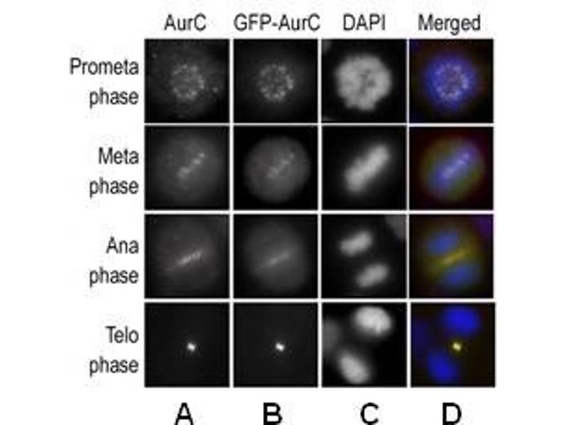 Chromosomal segregation during mitosis as well as meiosis is regulated by kinases and phosphatases. The Aurora kinases, members of the Ser/Thr protein kinase family, associate with microtubules during chromosome movement and segregation. Aurora kinase C may play a part in organizing microtubules in relation to the function of the centrosome/spindle pole during mitosis. This protein is localized to centrosome from anaphase to cytokinesis. Expression is limited to testis in normal cells. Elevated expression levels are seen only in a subset of cancer cells such as HepG2, HuH7 and HeLa cells. Aurora-C expression is maximum at M phase.Synonyms: AIE2, AIK3, AURKC, Aurora-C, Aurora/Ipl1-related kinase 3, Aurora/Ipl1/Eg2 protein 2, STK13, Serine/threonine-protein kinase 13