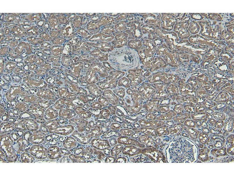 Immunohistochemistry: Paraffin embedded Human Kidney. Recommended concentration: 8 μg/mL.